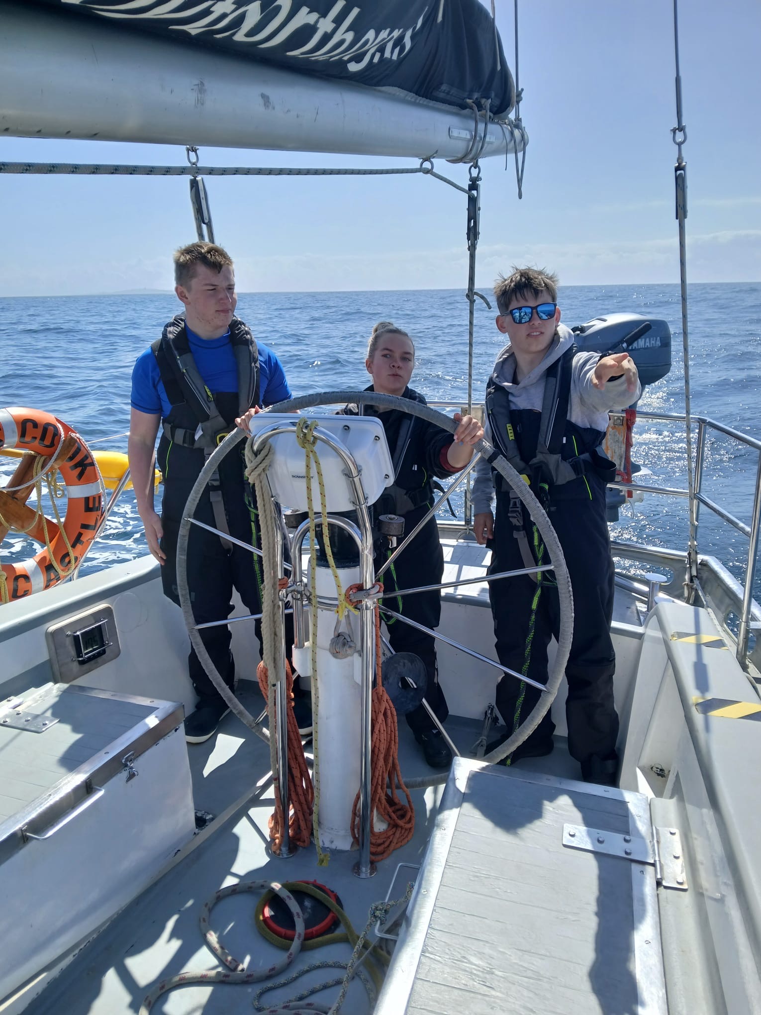 The Cadets were now steering the boat and keeping a lookout for any obstructions in the way. The main thing they were looking for is buoys attached by rope which indicates lobster pots - they are a danger to the boat as the rope could get wrapped around the propeller. The standby watch then hoisted the sails with great communication skills, all working as a team, and we were sailing! Co-ordinating all the jobs for the first time was a challenge, with half of the team balancing buckets and their roles as they battled through the sea sickness.